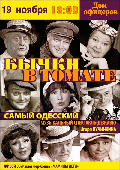 Бычки в томате состоится 19 ноября 2015, 19:00, четверг в Дом офицеров. С помощью сервиса internet-bilet.ua, Вы сможете с легкостью забронировать, заказать и купить билеты на интересующий Вас концерт, спектакль, оперу, балет, мастер-классы, спортивные и детские мероприятия, оплатив их самым удобным для Вас способом: через интернет банковской картой VISA/MasterCard, наличными или курьером, если сделаете заказ билета c доставкой.