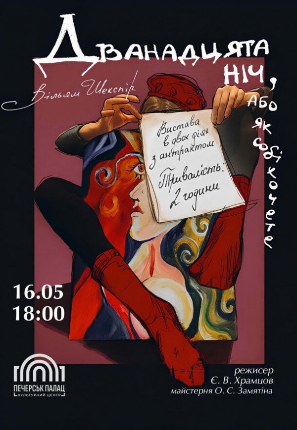 Спектакль "Двенадцатая ночь, или как захотите" состоится 16 мая 2026, 18:00, суббота в Культурный центр "Печерськ Палац". С помощью сервиса internet-bilet.ua, Вы сможете с легкостью забронировать, заказать и купить билеты на интересующий Вас концерт, спектакль, оперу, балет, мастер-классы, спортивные и детские мероприятия, оплатив их самым удобным для Вас способом: через интернет банковской картой VISA/MasterCard, наличными или курьером, если сделаете заказ билета c доставкой.
