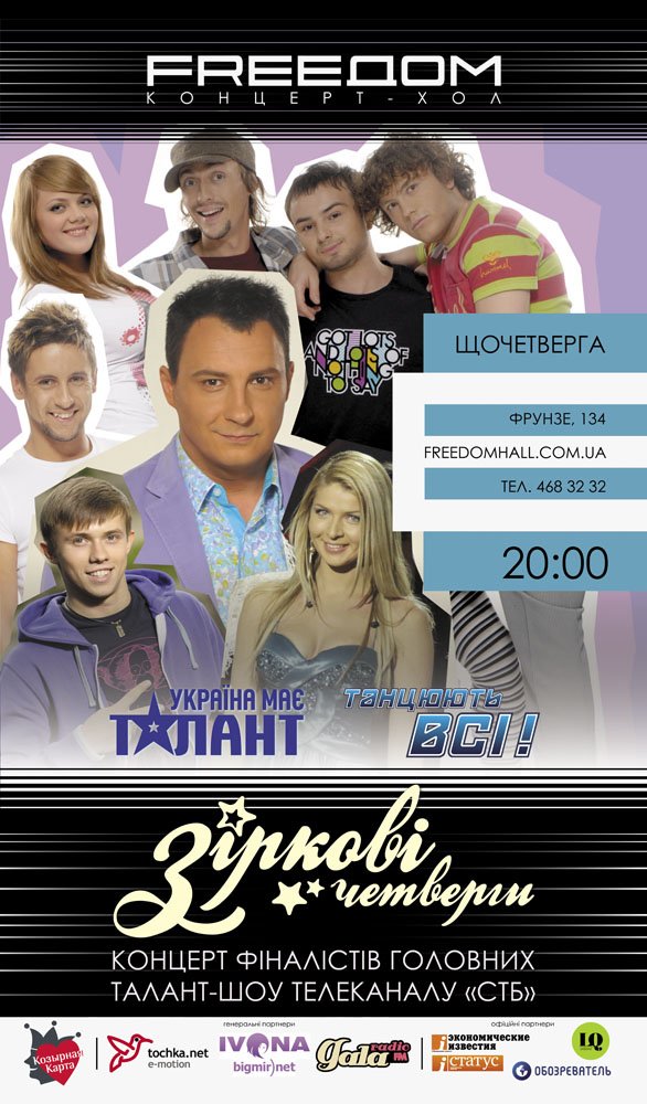 Звездные четверги в Freedom состоится 13 октября 2011, 20:00, четверг в Freedom Hall. С помощью сервиса internet-bilet.ua, Вы сможете с легкостью забронировать, заказать и купить билеты на интересующий Вас концерт, спектакль, оперу, балет, мастер-классы, спортивные и детские мероприятия, оплатив их самым удобным для Вас способом: через интернет банковской картой VISA/MasterCard, наличными или курьером, если сделаете заказ билета c доставкой.