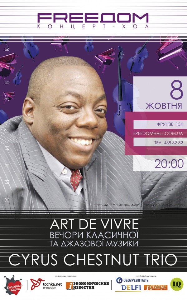 Трио Сайруса Честната в рамках вечеров классической и джазовой музыки «Art de Vivre» состоится 8 октября 2011, 20:00, суббота в Freedom Hall. С помощью сервиса internet-bilet.ua, Вы сможете с легкостью забронировать, заказать и купить билеты на интересующий Вас концерт, спектакль, оперу, балет, мастер-классы, спортивные и детские мероприятия, оплатив их самым удобным для Вас способом: через интернет банковской картой VISA/MasterCard, наличными или курьером, если сделаете заказ билета c доставкой.