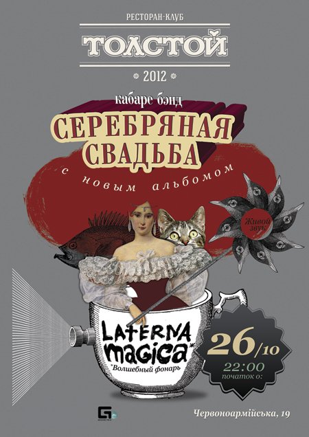 Серебряная Свадьба состоится 26 октября 2012, 22:00, пятница в Клуб-ресторан "Толстой". С помощью сервиса internet-bilet.ua, Вы сможете с легкостью забронировать, заказать и купить билеты на интересующий Вас концерт, спектакль, оперу, балет, мастер-классы, спортивные и детские мероприятия, оплатив их самым удобным для Вас способом: через интернет банковской картой VISA/MasterCard, наличными или курьером, если сделаете заказ билета c доставкой.
