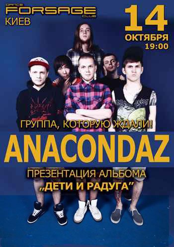 Anacondaz - «Дети и радуга» состоится 14 октября 2012, 19:00, воскресенье в Forsage Dance Club. С помощью сервиса internet-bilet.ua, Вы сможете с легкостью забронировать, заказать и купить билеты на интересующий Вас концерт, спектакль, оперу, балет, мастер-классы, спортивные и детские мероприятия, оплатив их самым удобным для Вас способом: через интернет банковской картой VISA/MasterCard, наличными или курьером, если сделаете заказ билета c доставкой.