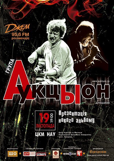 АукцЫон состоится 19 ноября 2011, 19:00, суббота в ЦКИ НАУ. С помощью сервиса internet-bilet.ua, Вы сможете с легкостью забронировать, заказать и купить билеты на интересующий Вас концерт, спектакль, оперу, балет, мастер-классы, спортивные и детские мероприятия, оплатив их самым удобным для Вас способом: через интернет банковской картой VISA/MasterCard, наличными или курьером, если сделаете заказ билета c доставкой.