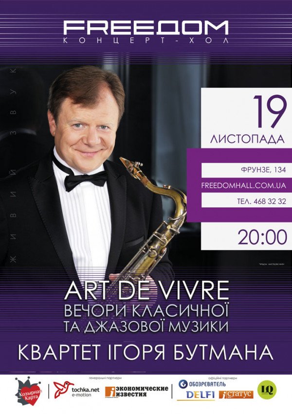Квартет Игоря Бутмана в рамках проведения вечеров классической и джазовой музыки «Art de Vivre» состоится 19 ноября 2011, 20:00, суббота в Freedom Hall. С помощью сервиса internet-bilet.ua, Вы сможете с легкостью забронировать, заказать и купить билеты на интересующий Вас концерт, спектакль, оперу, балет, мастер-классы, спортивные и детские мероприятия, оплатив их самым удобным для Вас способом: через интернет банковской картой VISA/MasterCard, наличными или курьером, если сделаете заказ билета c доставкой.