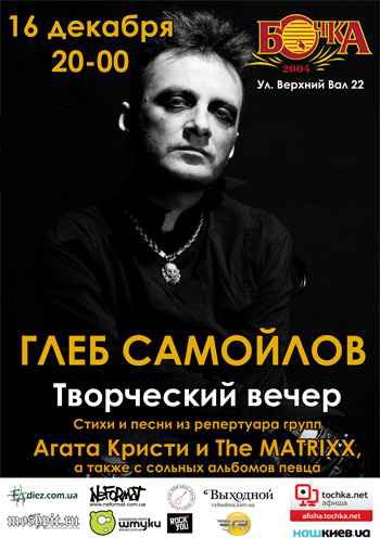 В киеве выступит Глеб Самойлов. На творческом вечере всех посетителей ожидают стихи и песни из репертуара групп Агата Кристи и The Matrixx, а также из сольных альбомов певца.