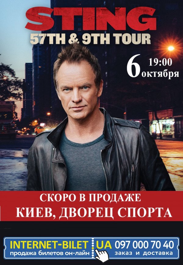 STING. 57th and 9th Tour. With special guest состоится 6 октября 2017, 20:00, пятница в Дворец Спорта. С помощью сервиса internet-bilet.ua, Вы сможете с легкостью забронировать, заказать и купить билеты на интересующий Вас концерт, спектакль, оперу, балет, мастер-классы, спортивные и детские мероприятия, оплатив их самым удобным для Вас способом: через интернет банковской картой VISA/MasterCard, наличными или курьером, если сделаете заказ билета c доставкой.