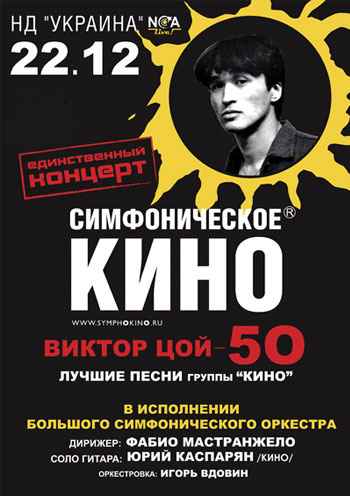 Виктор Цой – 50. Симфоническое кино состоится 22 декабря 2012, 18:00, суббота в Национальный дворец искусств "Украина". С помощью сервиса internet-bilet.ua, Вы сможете с легкостью забронировать, заказать и купить билеты на интересующий Вас концерт, спектакль, оперу, балет, мастер-классы, спортивные и детские мероприятия, оплатив их самым удобным для Вас способом: через интернет банковской картой VISA/MasterCard, наличными или курьером, если сделаете заказ билета c доставкой.