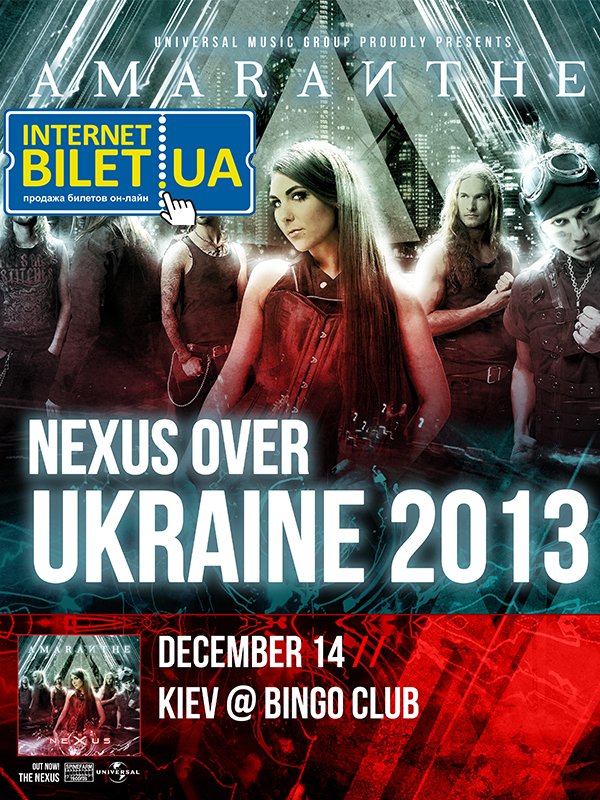 AMARANTHE состоится 29 ноября 2014, 19:00, суббота в Bingo. С помощью сервиса internet-bilet.ua, Вы сможете с легкостью забронировать, заказать и купить билеты на интересующий Вас концерт, спектакль, оперу, балет, мастер-классы, спортивные и детские мероприятия, оплатив их самым удобным для Вас способом: через интернет банковской картой VISA/MasterCard, наличными или курьером, если сделаете заказ билета c доставкой.