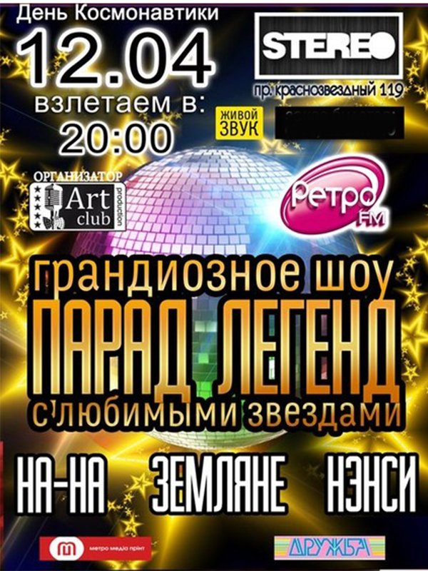 Грандиозным шоу «Парад Легенд» порадует Киевлян и гостей столицы 12 апреля,в День Космонавтики, concert-hall STEREO PLAZA . В самом романтическоми космическомконцерте года, берут участие легендарные коллективы 90-х: «На-На», «Земляне» и «Нэнси»!