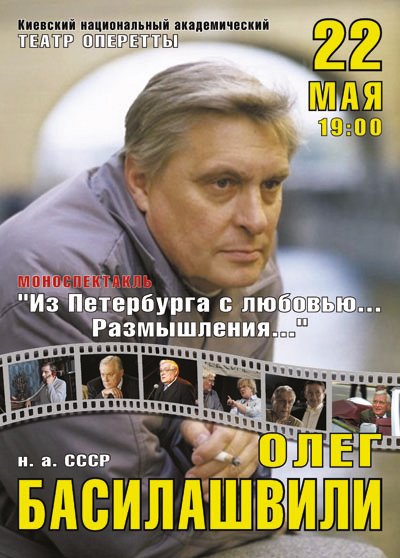Из Петербурга с любовью... Размышления... состоится 22 мая 2014, 19:00, четверг в Киевский национальный академический театр оперетты. С помощью сервиса internet-bilet.ua, Вы сможете с легкостью забронировать, заказать и купить билеты на интересующий Вас концерт, спектакль, оперу, балет, мастер-классы, спортивные и детские мероприятия, оплатив их самым удобным для Вас способом: через интернет банковской картой VISA/MasterCard, наличными или курьером, если сделаете заказ билета c доставкой.