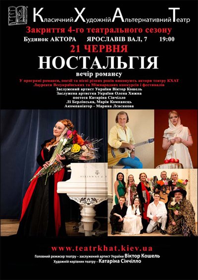 Классический Художественный Альтернативный Театр (КХАТ) предтавит всем ценителям театрального искуства вечер романса с участием всех актёров театра «Ностальгия». 21 июня 2014 года закрытие 4-го театрального сезона на сцене Дома актера.