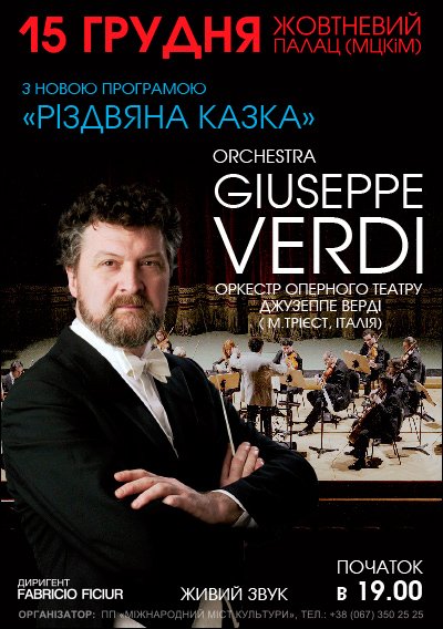 15 декабря 2014 года в МЦКиИ «Октябрьский дворец» с праздничным концертом выступит Камерный оркестр театра Джузеппе Верди из Италии под руководством знаменитого дирижёра Fabrizio Ficiur (Фабрицио Фичиури) с новой программой «Рождественская сказка»!