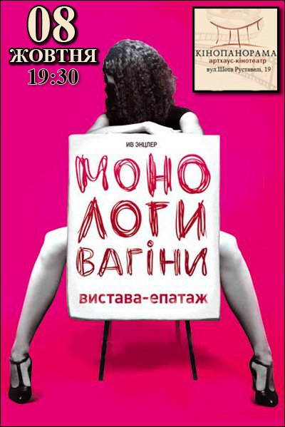 Монологи вагины состоится 8 октября 2014, 19:30, среда в Кинопанорама (Большой зал). С помощью сервиса internet-bilet.ua, Вы сможете с легкостью забронировать, заказать и купить билеты на интересующий Вас концерт, спектакль, оперу, балет, мастер-классы, спортивные и детские мероприятия, оплатив их самым удобным для Вас способом: через интернет банковской картой VISA/MasterCard, наличными или курьером, если сделаете заказ билета c доставкой.
