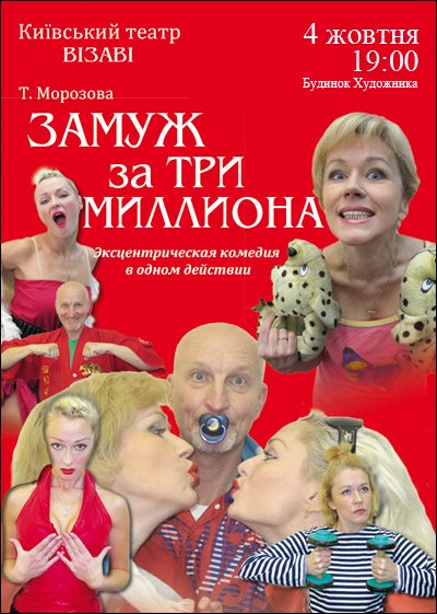 Киевский театр Визави приглашает на эксцентрическую комедию «Замуж за три миллиона». 4 октября 2014 года на сцене Центрального Дома Художника.