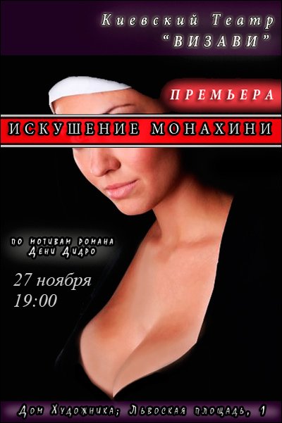 Искушение монахини состоится 27 ноября 2014, 19:00, четверг в Театр "Личности" (Центральный дом художника). С помощью сервиса internet-bilet.ua, Вы сможете с легкостью забронировать, заказать и купить билеты на интересующий Вас концерт, спектакль, оперу, балет, мастер-классы, спортивные и детские мероприятия, оплатив их самым удобным для Вас способом: через интернет банковской картой VISA/MasterCard, наличными или курьером, если сделаете заказ билета c доставкой.