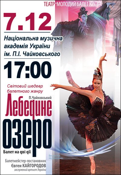 Лебединое озеро состоится 7 декабря 2014, 17:00, воскресенье в Национальная музыкальная академия Украины. С помощью сервиса internet-bilet.ua, Вы сможете с легкостью забронировать, заказать и купить билеты на интересующий Вас концерт, спектакль, оперу, балет, мастер-классы, спортивные и детские мероприятия, оплатив их самым удобным для Вас способом: через интернет банковской картой VISA/MasterCard, наличными или курьером, если сделаете заказ билета c доставкой.