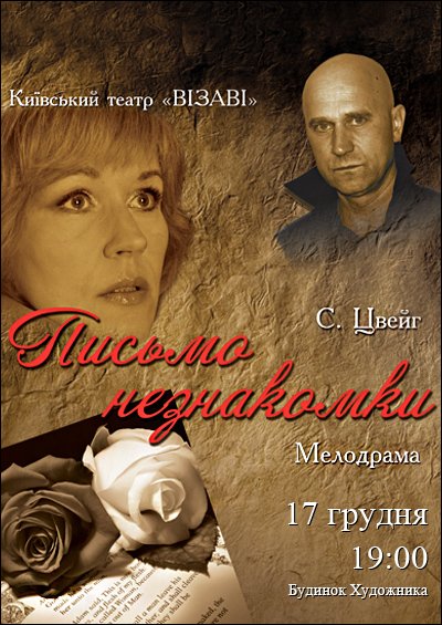 Письмо незнакомки состоится 17 декабря 2014, 19:00, среда в Театр "Личности" (Центральный дом художника). С помощью сервиса internet-bilet.ua, Вы сможете с легкостью забронировать, заказать и купить билеты на интересующий Вас концерт, спектакль, оперу, балет, мастер-классы, спортивные и детские мероприятия, оплатив их самым удобным для Вас способом: через интернет банковской картой VISA/MasterCard, наличными или курьером, если сделаете заказ билета c доставкой.