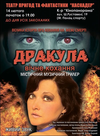 Театр приключений и фантастики «Каскадер» предлагает вашему вниманию великую историю любви на грани жизни и смерти - мистический музыкальный спектакль «Дракула. Вечная любовь» на сцене кинотеатра «Кинопанорама» 14 февраля 2015 года.