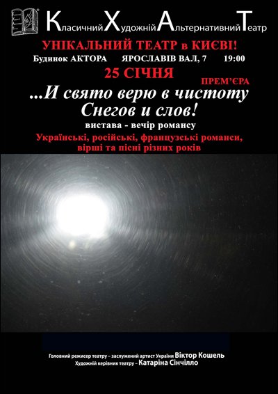 Классический Художественный Альтернативный Театр (КХАТ) пргглашает всех ценителей театрального искусcтва на спектакль-вечер романса «...И свято верю в чистоту Снегов и Слов!». 25 января 2015 года на сцене Дома актера.
