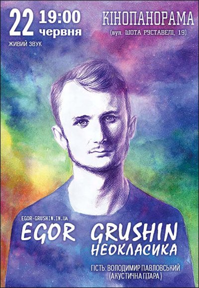 Когда он садится за рояль - время теряет свою важность и все течение сегодняшних забот растворяется в вечности. Именно такие ощущения возникают у всех присутствующих в зрительном зале, когда за рояль садится молодой возрастом, но творец с большой буквы Егор Грушин. Его без сомнения можно назвать «гордостью Украины», как когда-то классики Моцарт, Бах, Бетховен чеканили собственными произведениями свои имена в вечности, так и Егор Грушин уже входит в ТОП 200 классических композиторов всего мира, по версии крупнейшего музыкального портала reverbnation.com. Егор Грушин один из немногих представителей неоклассического стиля в Украине. Его новаторство в современном украинском искусстве очевидное и неоспоримое. Всем композициям, которые создает музыкант присущ собственный неоклассический стиль.