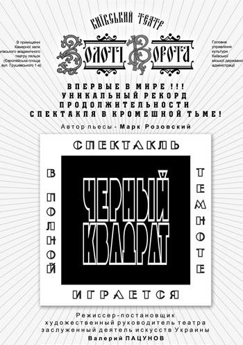 Черный Квадрат состоится 22 мая 2012, 19:00, вторник в Театр "Золотые Ворота". С помощью сервиса internet-bilet.ua, Вы сможете с легкостью забронировать, заказать и купить билеты на интересующий Вас концерт, спектакль, оперу, балет, мастер-классы, спортивные и детские мероприятия, оплатив их самым удобным для Вас способом: через интернет банковской картой VISA/MasterCard, наличными или курьером, если сделаете заказ билета c доставкой.