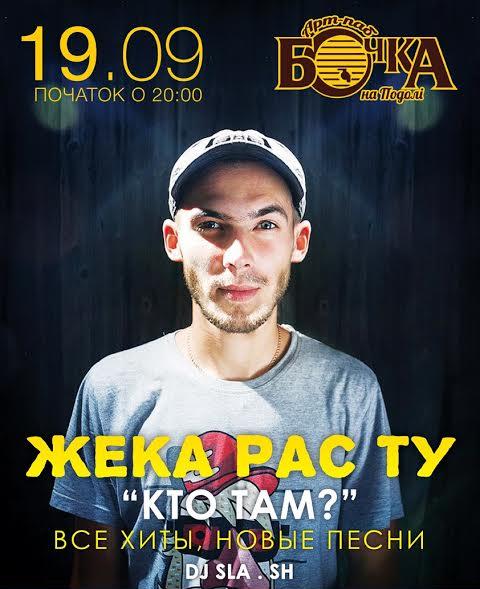 ЖЕКА РАС ТУ состоится 19 сентября 2015, 20:00, суббота в Арт-Паб "Бочка". С помощью сервиса internet-bilet.ua, Вы сможете с легкостью забронировать, заказать и купить билеты на интересующий Вас концерт, спектакль, оперу, балет, мастер-классы, спортивные и детские мероприятия, оплатив их самым удобным для Вас способом: через интернет банковской картой VISA/MasterCard, наличными или курьером, если сделаете заказ билета c доставкой.