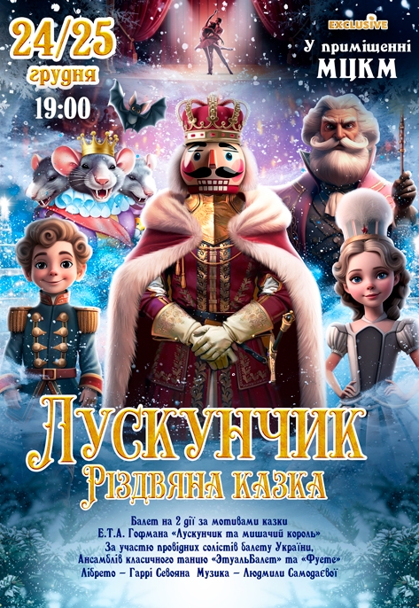Мистическая история, где кукольных дел мастер, Дроссельмейер — самый настоящий маг, юная Мария видит духовную красоту и благородство прекрасного Принца в невзрачной деревянной игрушке, а храбрый Щелкунчик сможет победить войско коварного Мишиного Короля. Герои восхищают и наполняют сердца верой через добро и любовь! Совершенно новое либретто заслуженного артиста Украины Гарри Севояна и современная музыка украинской композиторши Людмилы Самодаевой, изысканные движения артистов балета и утонченное хореографическое мастерство.
