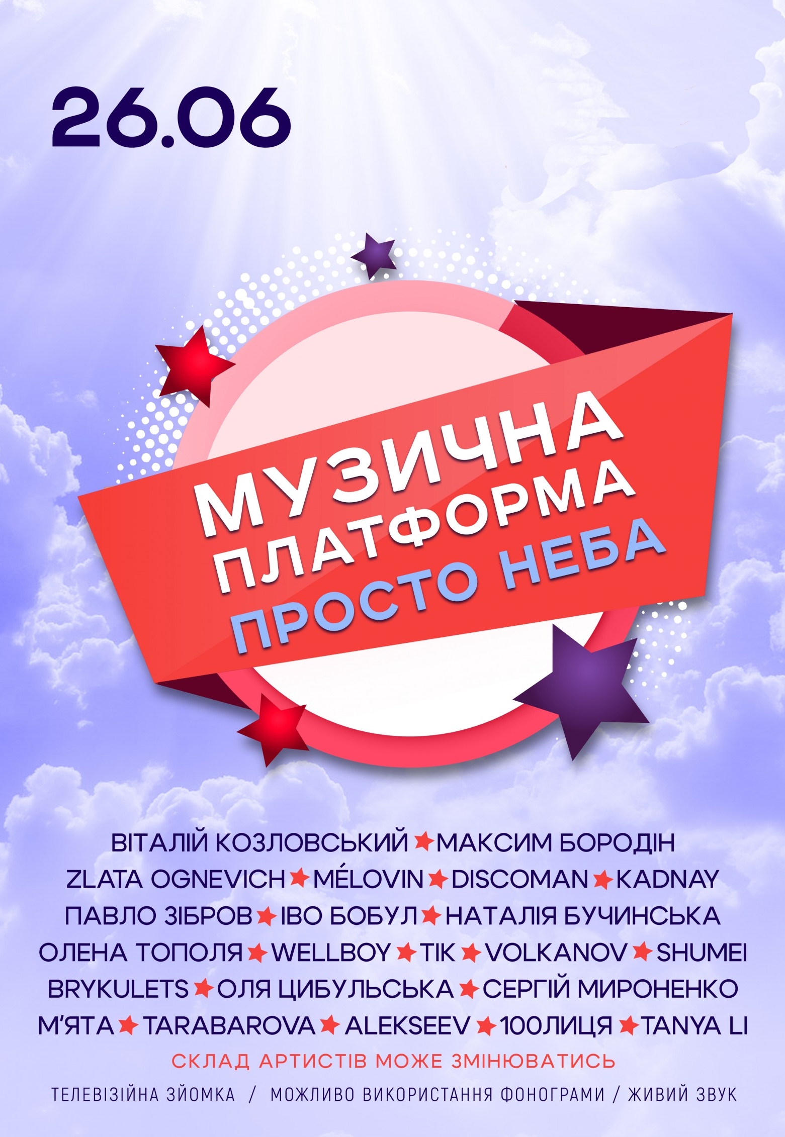 Музыкальная платформа Украины состоится 26 июня 2026, 18:30, пятница в ВДНХ, Feels Garden. С помощью сервиса internet-bilet.ua, Вы сможете с легкостью забронировать, заказать и купить билеты на интересующий Вас концерт, спектакль, оперу, балет, мастер-классы, спортивные и детские мероприятия, оплатив их самым удобным для Вас способом: через интернет банковской картой VISA/MasterCard, наличными или курьером, если сделаете заказ билета c доставкой.