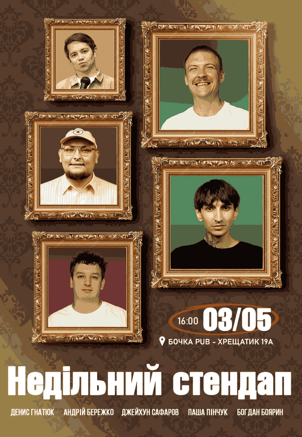 Воскресный стендап состоится 3 мая 2026, 16:00, воскресенье в Бочка Pub. С помощью сервиса internet-bilet.ua, Вы сможете с легкостью забронировать, заказать и купить билеты на интересующий Вас концерт, спектакль, оперу, балет, мастер-классы, спортивные и детские мероприятия, оплатив их самым удобным для Вас способом: через интернет банковской картой VISA/MasterCard, наличными или курьером, если сделаете заказ билета c доставкой.
