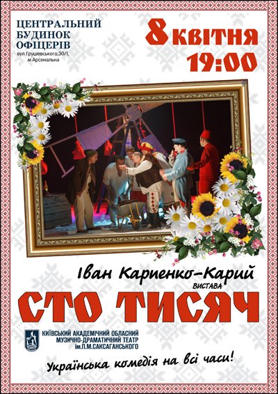 8 квітня 2016 року Київський академічний музично-драматичний театр імені П.К. Саксаганського презентує першу в цьому сезоні прем’єру - «Сто тисяч» І.Карпенка-Карого на сцені Будинку офіцерів. Шалена комедія життя, де кожен глядач не тільки відпочине душею, а й сповна насолодиться позитивом та хорошим настроєм!