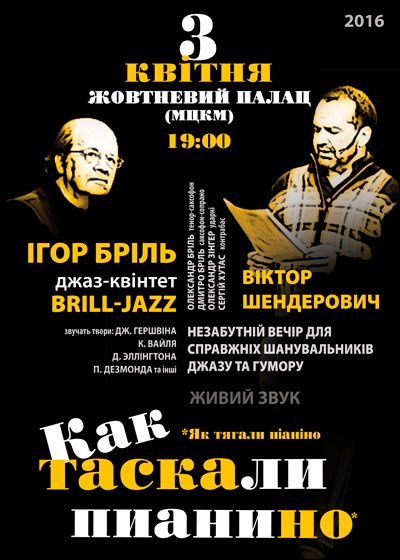 Писатель-сатирик Виктор Шендерович, звезда мирового класса - джазовый пианист Игорь Бриль и джаз-квинтет Brill-Jazz сочинили музыкальный спектакль «Как таскали пианино» - «о разных временах в которых мы жили - и о джазе, который во всякое время оказывался к месту». Этот спектакль - синтез настоящей музыки и юмора В. Шендеровича. Участники постановки приглашают зрителей в путешествие по ХХ веку, иронический вояж сквозь времена и страны под любимые композиции.