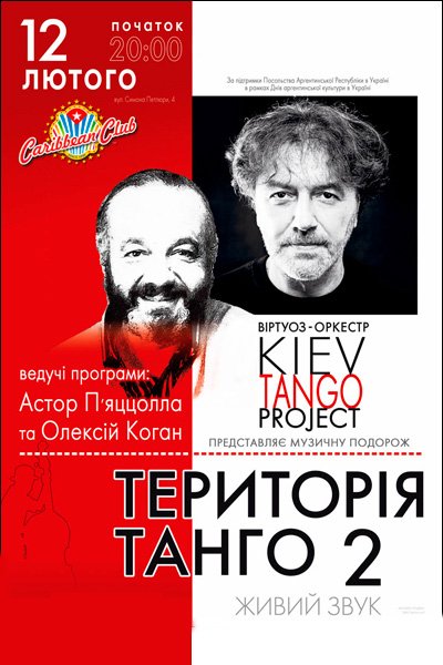 Kiev Tango Project «Территория Танго - 2» состоится 12 февраля 2016, 20:00, пятница в Caribbean Club. С помощью сервиса internet-bilet.ua, Вы сможете с легкостью забронировать, заказать и купить билеты на интересующий Вас концерт, спектакль, оперу, балет, мастер-классы, спортивные и детские мероприятия, оплатив их самым удобным для Вас способом: через интернет банковской картой VISA/MasterCard, наличными или курьером, если сделаете заказ билета c доставкой.