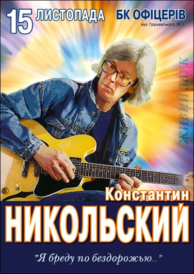 Константин Никольский состоится 15 ноября 2014, 19:00, суббота в Дом офицеров. С помощью сервиса internet-bilet.ua, Вы сможете с легкостью забронировать, заказать и купить билеты на интересующий Вас концерт, спектакль, оперу, балет, мастер-классы, спортивные и детские мероприятия, оплатив их самым удобным для Вас способом: через интернет банковской картой VISA/MasterCard, наличными или курьером, если сделаете заказ билета c доставкой.