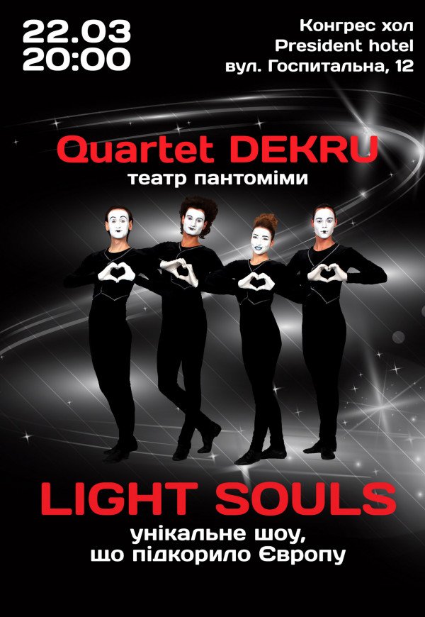 Quartet DEKRU. LIGHT SOULS состоится 22 марта 2019, 20:00, пятница в Президент отель. Зал Конгресс холл. С помощью сервиса internet-bilet.ua, Вы сможете с легкостью забронировать, заказать и купить билеты на интересующий Вас концерт, спектакль, оперу, балет, мастер-классы, спортивные и детские мероприятия, оплатив их самым удобным для Вас способом: через интернет банковской картой VISA/MasterCard, наличными или курьером, если сделаете заказ билета c доставкой.