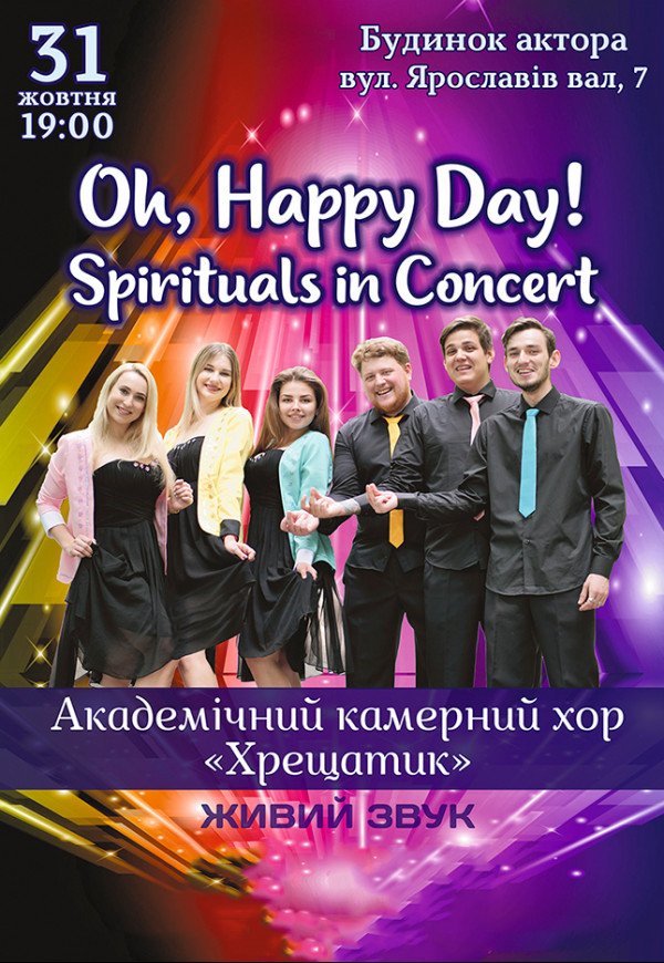 Oh, Happy Day! Spirituals in Concert состоится 31 октября 2018, 19:00, среда в Дом Актёра. С помощью сервиса internet-bilet.ua, Вы сможете с легкостью забронировать, заказать и купить билеты на интересующий Вас концерт, спектакль, оперу, балет, мастер-классы, спортивные и детские мероприятия, оплатив их самым удобным для Вас способом: через интернет банковской картой VISA/MasterCard, наличными или курьером, если сделаете заказ билета c доставкой.