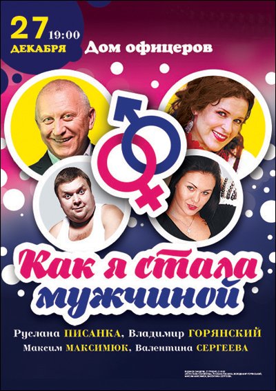 Как я стала мужчиной состоится 27 декабря 2015, 19:00, воскресенье в Дом офицеров. С помощью сервиса internet-bilet.ua, Вы сможете с легкостью забронировать, заказать и купить билеты на интересующий Вас концерт, спектакль, оперу, балет, мастер-классы, спортивные и детские мероприятия, оплатив их самым удобным для Вас способом: через интернет банковской картой VISA/MasterCard, наличными или курьером, если сделаете заказ билета c доставкой.