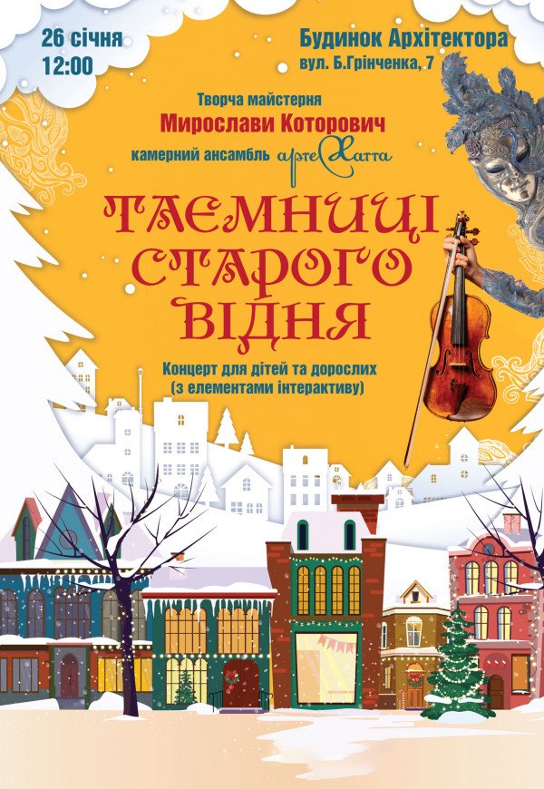 Тайны старой Вены состоится 26 января 2019, 12:00, суббота в Киевский дом Архитектора. С помощью сервиса internet-bilet.ua, Вы сможете с легкостью забронировать, заказать и купить билеты на интересующий Вас концерт, спектакль, оперу, балет, мастер-классы, спортивные и детские мероприятия, оплатив их самым удобным для Вас способом: через интернет банковской картой VISA/MasterCard, наличными или курьером, если сделаете заказ билета c доставкой.