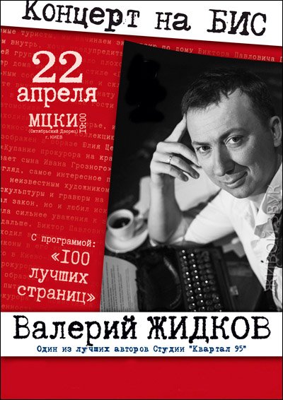 Валерий Жидков «100 лучших страниц». Концерт на «бис» 22 апреля 2016 года в Киеве в «Октябрьском Дворце» у поклонников литературного юмора вновь появится возможность насладиться этим жанром в полной мере.