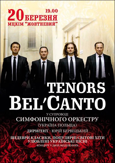 Tenors Bel’canto відбудеться 20 березня 2015, 19:00, п’ятниця в МЦКМ (Жовтневий Палац) . За допомогою сервісу internet-bilet.ua, Ви зможете з легкістю забронювати, замовити та купити квитки на концерт, спектакль, оперу, балет, майстер-класи, спортивні та дитячі заходи, що Вас цікавлять, оплативши їх найбільш зручним для Вас способом: через інтернет банківською карткою VISA/MasterCard, готівкою або кур'єром, якщо зробите замовлення квитка з доставкою.