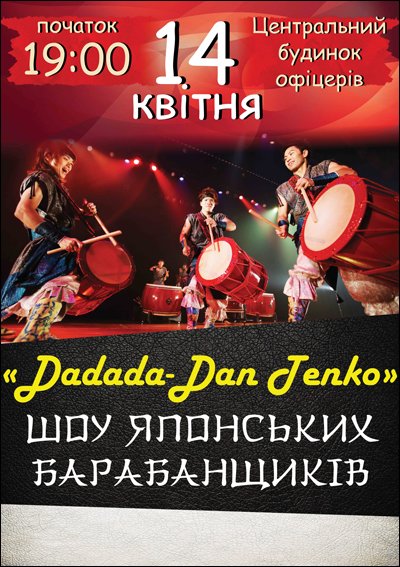 «Dadada-Dan Tenko» шоу японских барабанщиков відбудеться 14 квітня 2016, 19:00, четвер в Будинок офіцерів. За допомогою сервісу internet-bilet.ua, Ви зможете з легкістю забронювати, замовити та купити квитки на концерт, спектакль, оперу, балет, майстер-класи, спортивні та дитячі заходи, що Вас цікавлять, оплативши їх найбільш зручним для Вас способом: через інтернет банківською карткою VISA/MasterCard, готівкою або кур'єром, якщо зробите замовлення квитка з доставкою.