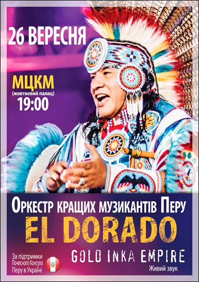 El Dorado «Gold Inka Empire» відбудеться 26 вересня 2015, 19:00, субота в МЦКМ (Жовтневий Палац) . За допомогою сервісу internet-bilet.ua, Ви зможете з легкістю забронювати, замовити та купити квитки на концерт, спектакль, оперу, балет, майстер-класи, спортивні та дитячі заходи, що Вас цікавлять, оплативши їх найбільш зручним для Вас способом: через інтернет банківською карткою VISA/MasterCard, готівкою або кур'єром, якщо зробите замовлення квитка з доставкою.