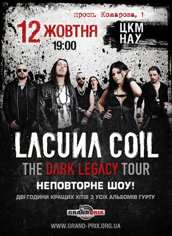 Lacuna Coil відбудеться 12 жовтня 2012, 19:00, п’ятниця в ЦКМ НАУ. За допомогою сервісу internet-bilet.ua, Ви зможете з легкістю забронювати, замовити та купити квитки на концерт, спектакль, оперу, балет, майстер-класи, спортивні та дитячі заходи, що Вас цікавлять, оплативши їх найбільш зручним для Вас способом: через інтернет банківською карткою VISA/MasterCard, готівкою або кур'єром, якщо зробите замовлення квитка з доставкою.