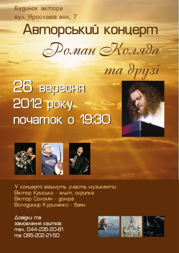26 сентября в Доме актера пройдет концерт серии «Роман Коляда и друзья». Во время этого концерта все поклонники талантливого автора-пианиста Романа Коляды и его друзей, получат возможность насладиться их музыкой вживую