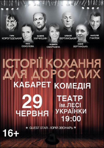 Истории любви для взрослых відбудеться 29 червня 2016, 19:00, середа в Національний академічний драматичний театр ім. Лесі Українки . За допомогою сервісу internet-bilet.ua, Ви зможете з легкістю забронювати, замовити та купити квитки на концерт, спектакль, оперу, балет, майстер-класи, спортивні та дитячі заходи, що Вас цікавлять, оплативши їх найбільш зручним для Вас способом: через інтернет банківською карткою VISA/MasterCard, готівкою або кур'єром, якщо зробите замовлення квитка з доставкою.