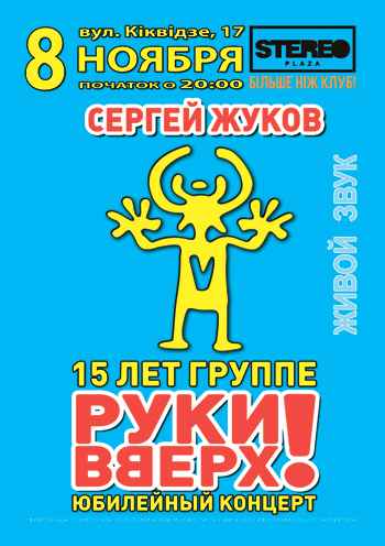 Руки вверх відбудеться 8 листопада 2012, 20:00, четвер в Stereo Plaza. За допомогою сервісу internet-bilet.ua, Ви зможете з легкістю забронювати, замовити та купити квитки на концерт, спектакль, оперу, балет, майстер-класи, спортивні та дитячі заходи, що Вас цікавлять, оплативши їх найбільш зручним для Вас способом: через інтернет банківською карткою VISA/MasterCard, готівкою або кур'єром, якщо зробите замовлення квитка з доставкою.