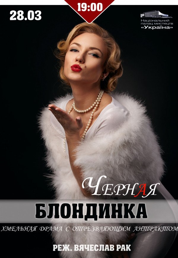 Спектакль «Черная блондинка» відбудеться 28 березня 2017, 19:00, вівторок в Національний палац мистецтв "Україна". За допомогою сервісу internet-bilet.ua, Ви зможете з легкістю забронювати, замовити та купити квитки на концерт, спектакль, оперу, балет, майстер-класи, спортивні та дитячі заходи, що Вас цікавлять, оплативши їх найбільш зручним для Вас способом: через інтернет банківською карткою VISA/MasterCard, готівкою або кур'єром, якщо зробите замовлення квитка з доставкою.