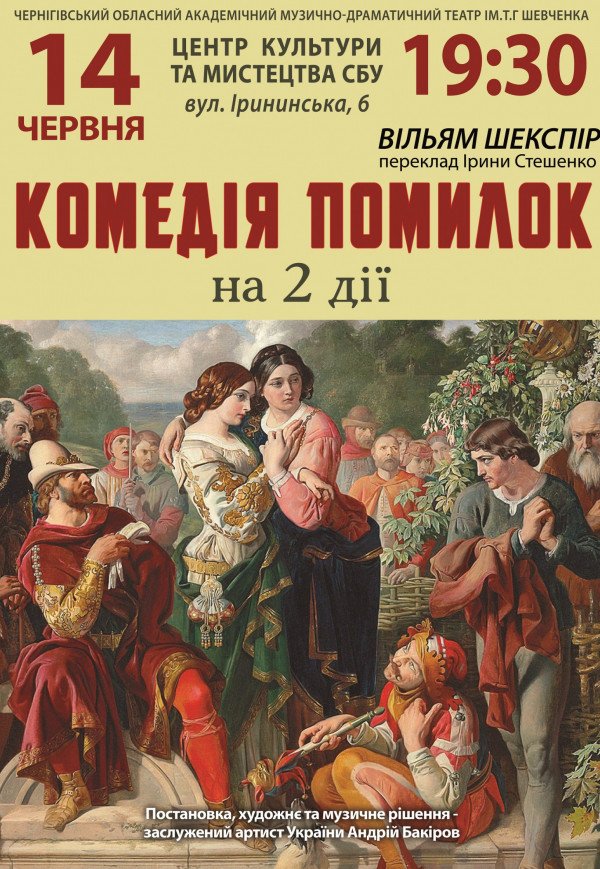 Вже третій рік поспіль неодмінній успіх серед глядачів має шекспірівська «Комедія помилок», поставлена заслуженим артистом України Андрієм Бакіровим,. Недаремно ця вистава здобула перше місце уномінації «кращий режисерський задум та втілення» на Міжнародному фестивалі «Золоті оплески Буковини»-2015 у Чернівцях і була удостоєна Гран-прі на Міжнародному фестивалі «Мельпомена Таврії»-2016 у Херсоні. З повними аншлагами ця енергійна, інтригуюча комедійна виставапройшла на сценах багатьох театрів України і Білорусі.