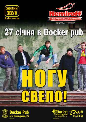 Ногу Свело відбудеться 27 січня 2013, 21:00, неділя в Docker Pub. За допомогою сервісу internet-bilet.ua, Ви зможете з легкістю забронювати, замовити та купити квитки на концерт, спектакль, оперу, балет, майстер-класи, спортивні та дитячі заходи, що Вас цікавлять, оплативши їх найбільш зручним для Вас способом: через інтернет банківською карткою VISA/MasterCard, готівкою або кур'єром, якщо зробите замовлення квитка з доставкою.