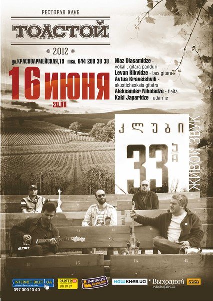 группа "33а" відбудеться 16 червня 2013, 20:00, неділя в Клуб-ресторан "Толстой". За допомогою сервісу internet-bilet.ua, Ви зможете з легкістю забронювати, замовити та купити квитки на концерт, спектакль, оперу, балет, майстер-класи, спортивні та дитячі заходи, що Вас цікавлять, оплативши їх найбільш зручним для Вас способом: через інтернет банківською карткою VISA/MasterCard, готівкою або кур'єром, якщо зробите замовлення квитка з доставкою.