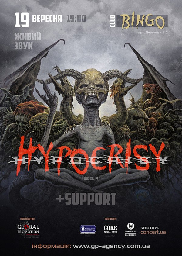 HУPOCRISY відбудеться 19 вересня 2013, 19:00, четвер в Bingo. За допомогою сервісу internet-bilet.ua, Ви зможете з легкістю забронювати, замовити та купити квитки на концерт, спектакль, оперу, балет, майстер-класи, спортивні та дитячі заходи, що Вас цікавлять, оплативши їх найбільш зручним для Вас способом: через інтернет банківською карткою VISA/MasterCard, готівкою або кур'єром, якщо зробите замовлення квитка з доставкою.
